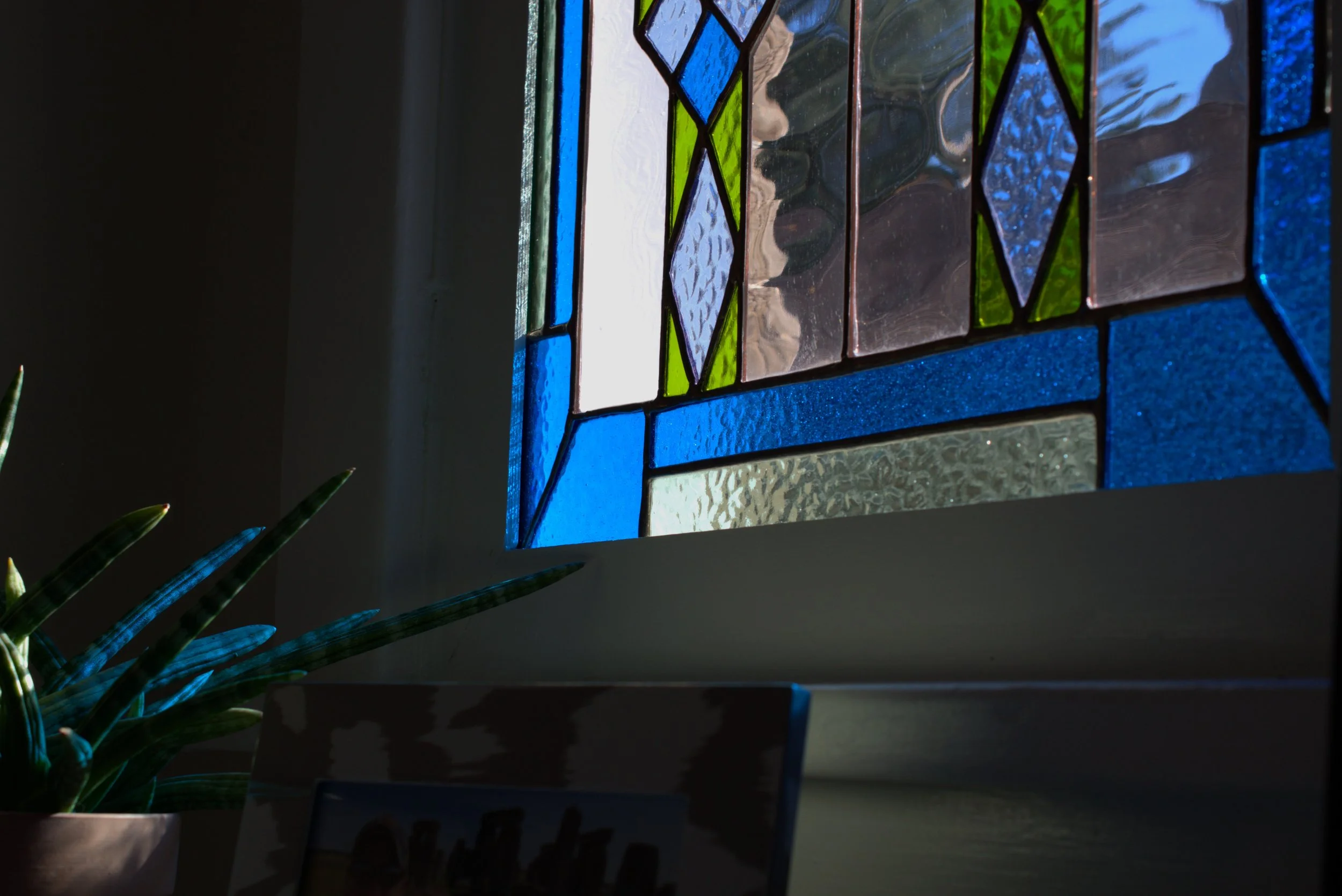 Located in a historic bungalow in Denver’s Washington Park, where the clients envisioned a pair of sister windows to frame their living room fireplace. Inspired by the Craftsman era, I explored designs that celebrated classic geometry while honoring their request for blue and green tones. Cathedral-style glass was chosen to transform the south-facing light into lively reflections that move through the space throughout the day. By combining muted and saturated hues, and seamlessly integrating the windows into the existing frames, this work brings together timeless design and intentional craftsmanship—an invitation for light, color, and history to coexist.